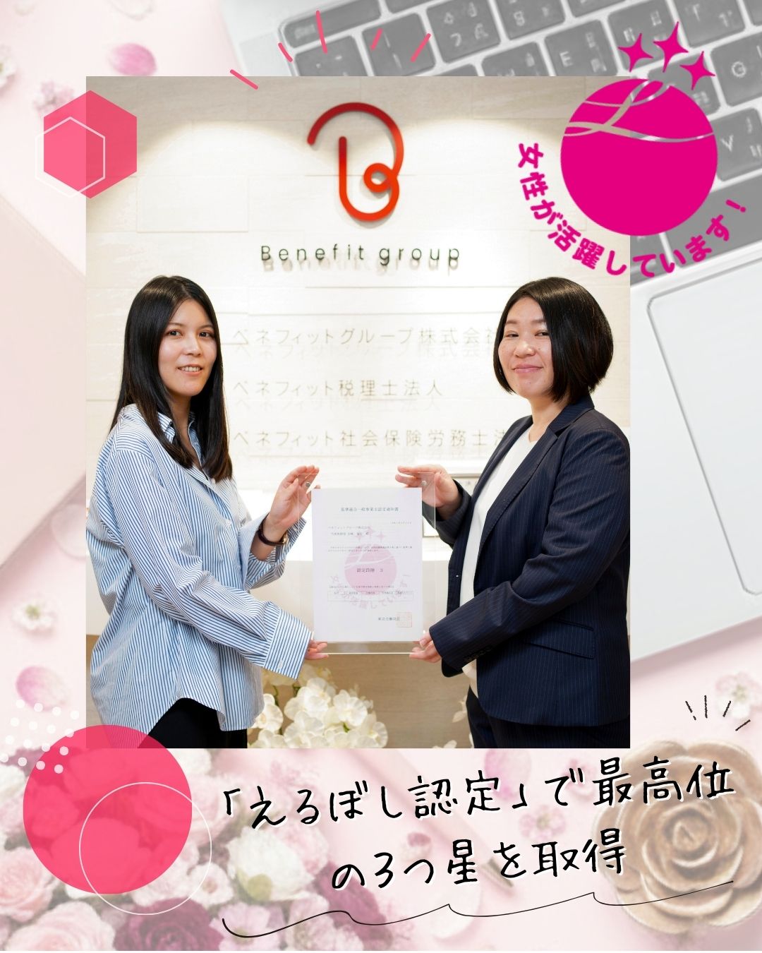 ベネフィットグループは、2025年3月11日付で、 女性活躍推進法に基づく「えるぼし認定」で最高位の3つ星を取得しました。
